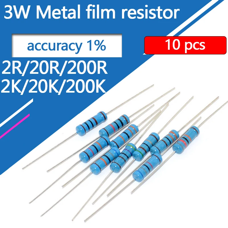 10pcs 3W Metal Film Resistor 2R 20R 200R 2K 20K 200K 2 20 200 Ohm R K 1% Five-Color Ring Resistance 0.1R-910K