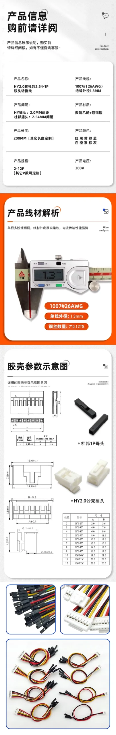 10Pcs HY2.0 to Dupont line electronic wire-2P/3P/4P/5P/6 Pin To 2.54mm Dupont Male/Female Wire Connector Color Cable