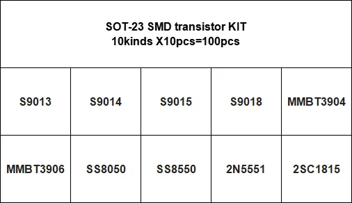 10Value/18Kind SOT23 Transistor KIT SMD MMBT3904 MMBT3906 S9012 S9013 S9014 S9015 S9018 SS8050 SS8550 S8050 S8550 2N5551 2SC1815