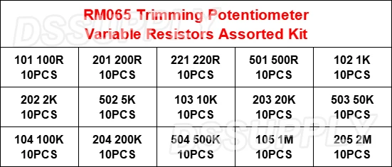150PCS/Set Free Box RM065 RM-065 Trimming Potentiometer 100 1K 2K 5K 10K 20K 50K 100K 200K 500K Variable Resistors Assorted Kit