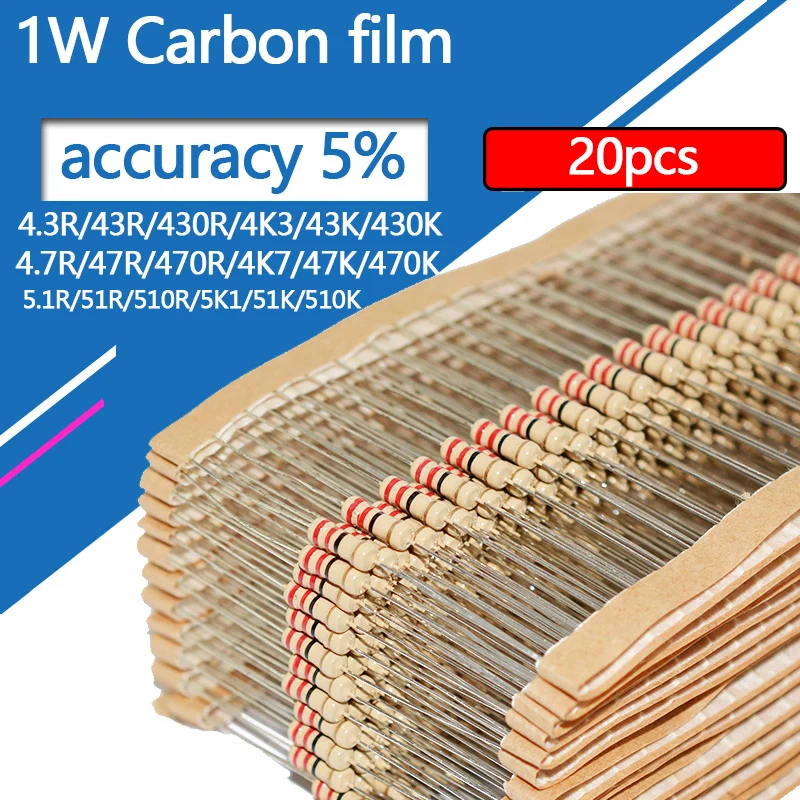 20pcs 1W Carbon Film Resistor 4.3 4.7 5.1 43 47 51 430 470 510 Ohm R K 5% Resistance 4R3 4R7 5R1 4.7K 5.1K 47R 470R 510R 0.1R-3M