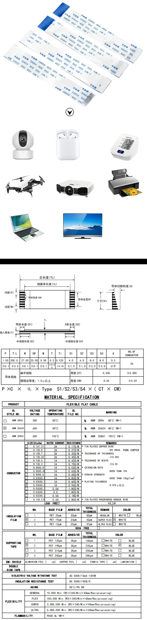 2PCS FPC FFC Cable 4/6/8/10/12/14/16/18/20/30/40P Pitch Ribbon Flexible Flat 0.5MM 1.0MM 500MM/600MM/800MM/1000MM/2000MM/3000MM