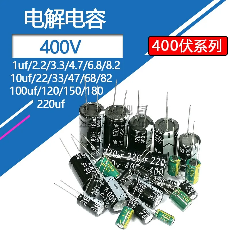 | Capacitance | 400v 8.2uf 20pcs, 400v 10uf 20pcs, 400v 15uf 20pcs, 400v 22uf 10pcs, 400v 33uf 10pcs, 400v 47uf13x25 5pcs, 400v 47uf16x20 5pcs, 400v 68uf 5pcs, 400v 1uf 20pcs, 400v 2.2uf 20pcs, 400v 3.3uf 20pcs, 400v 4.7uf 20pcs, 400v 6.8uf 20pcs, 400v 82uf 5pcs, 400v 100uf 5pcs, 400v 120uf 5pcs, 400v 150uf 5pcs, 400v 180uf 5pcs, 400v 220uf 2pcs |
