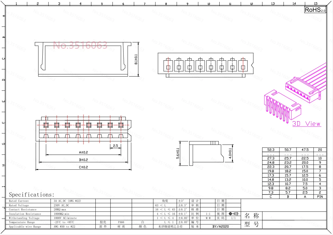 JAE 2.5mm Cable JAE2.5 8-Pin Single-Headed UL1007 PVC Cable