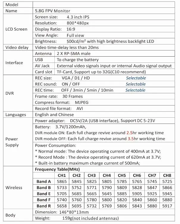 5.8G FPV Monitor with DVR 40CH 4.3 Inch LCD Display 16:9 NTSC/PAL Auto Search Video Recording RC FPV Multicopter