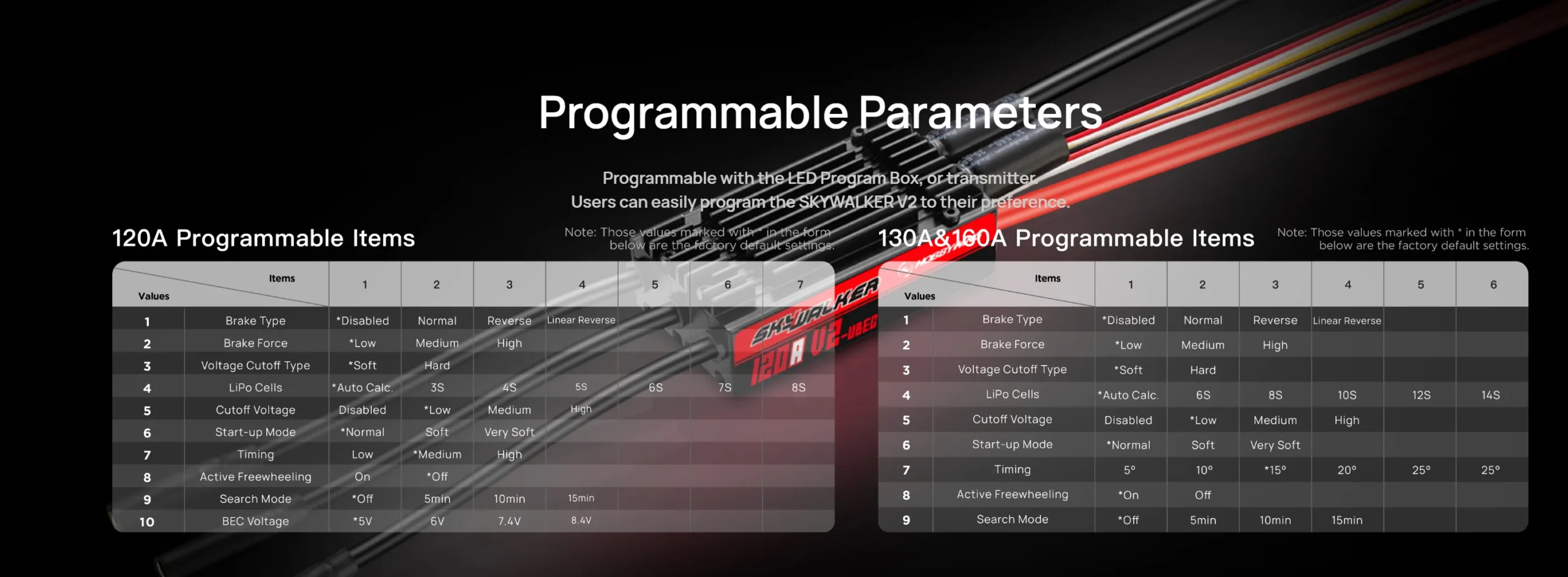 | Color | 120A with BEC, 130A No BEC, 160A No BEC |