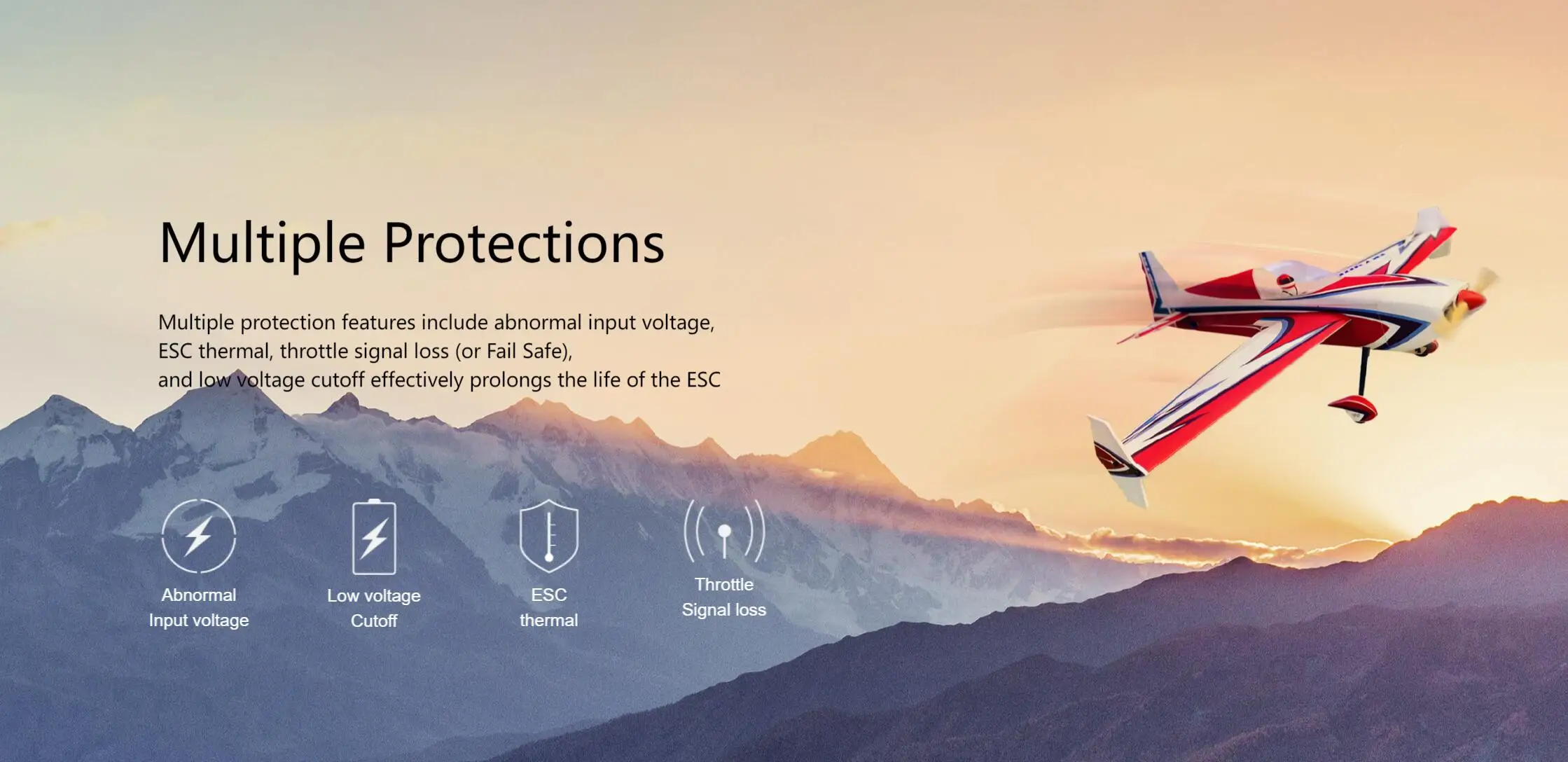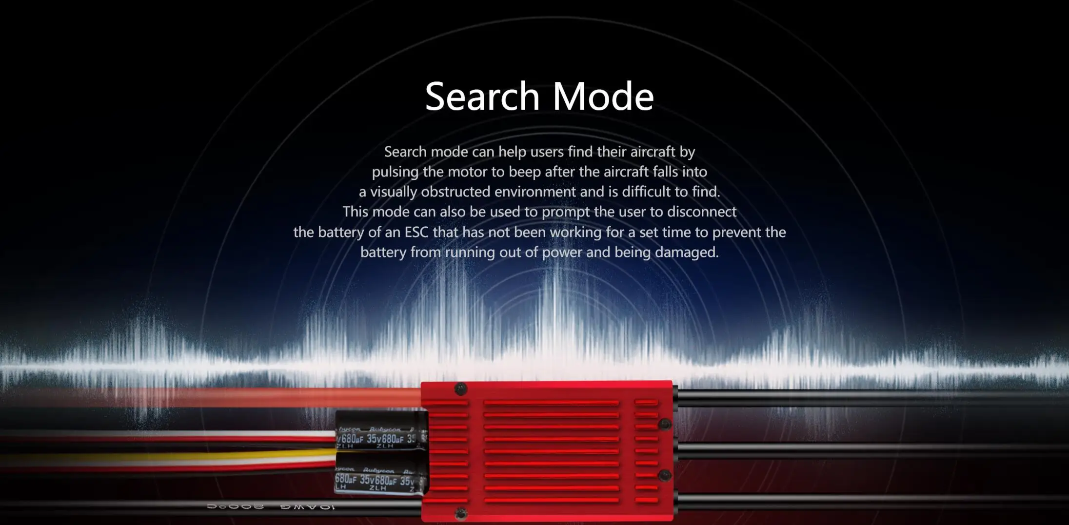 It has a search mode, and when the aircraft falls into a complex environment and is difficult to find, it can be found by using the specific prompt sound emitted by the electrically adjustable drive motor. This mode can also be used to prompt users to disconnect batteries that have been connected to the power regulator for a long time but are not working, in order to prevent damage caused by battery depletion.