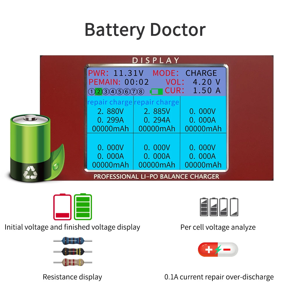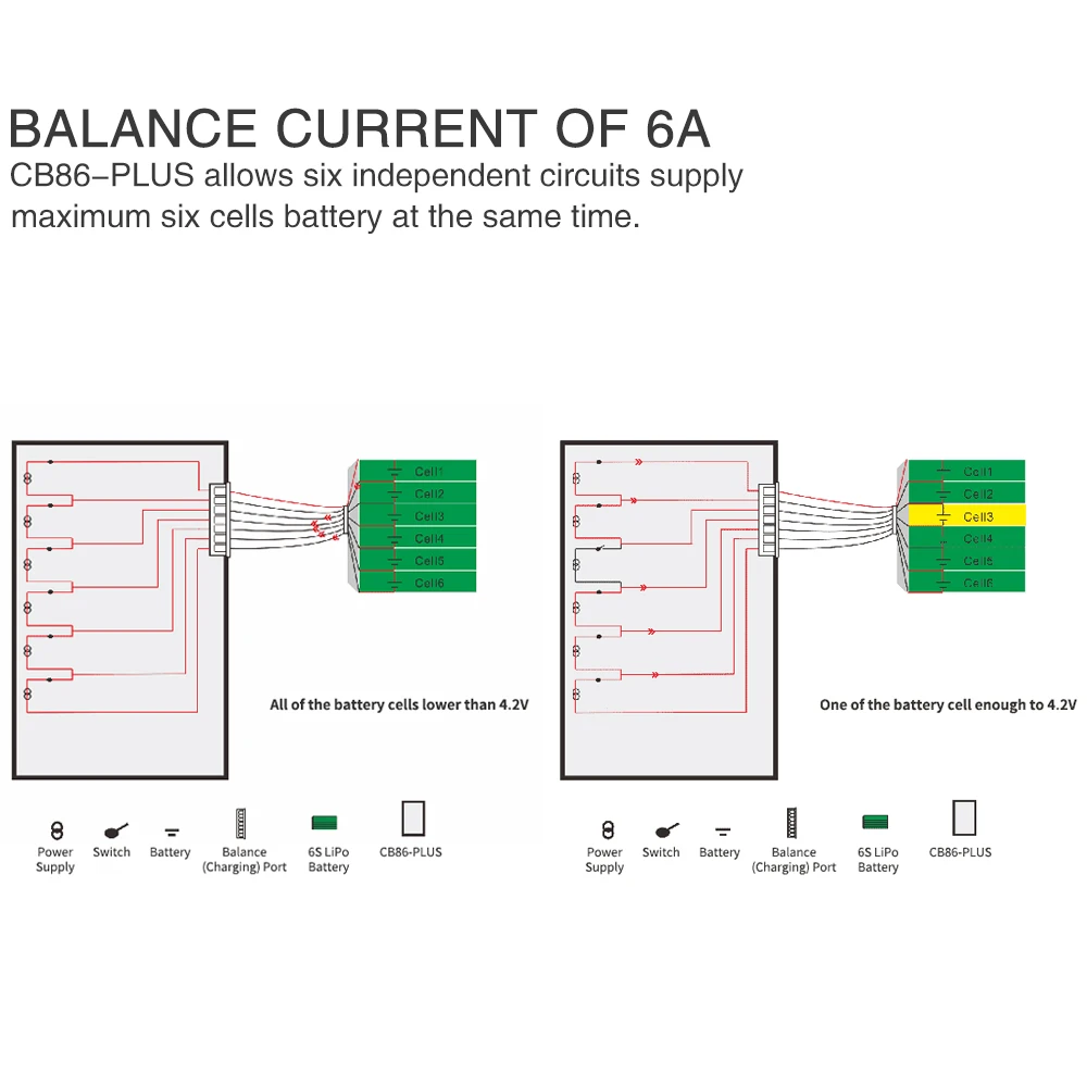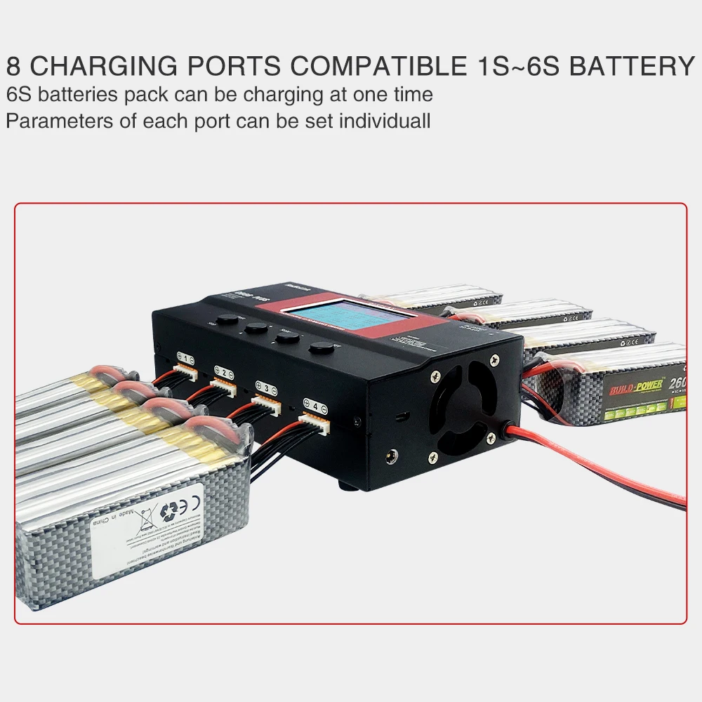 Supporting battery: 1S~6S LiPo battery (4.2V), 1S~6S Li-ion battery (8 ports available), or 1S~6S High voltage lithium battery (4.35V)