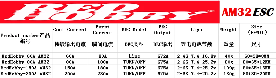 Be the first to review “RedHobby AM32 60A 80A 150A 200A Programming Brushless ESC 2-6S BEC 6V/2A 6V/5A For 1/10 1/8 RC Crawler Car Axial TRX SCX10 TRX4” Cancel reply
