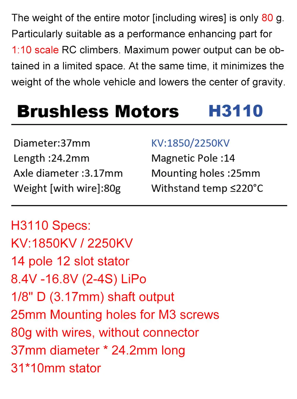 Four-wheel Drive Attributes: H3110 1850KV Brushless Motor
