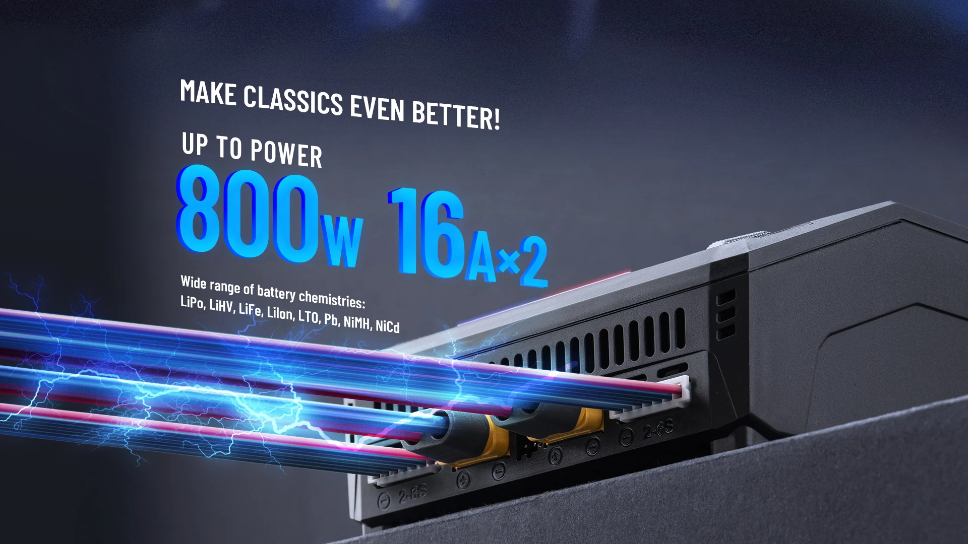 Supports up to 800W DC and 300W AC, efficiently balancing power distribution across two ports for versatile charging needs. Handles LiPo, LiHV, LiIon, LiFe, LTO, NiMH, and Pb batteries simultaneously.