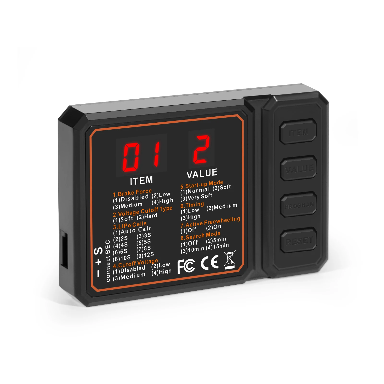 After selected this option, the ESC will gradually reduce the output to 60% of the full power in 3 seconds after the low-voltage cutoff protection is activated.